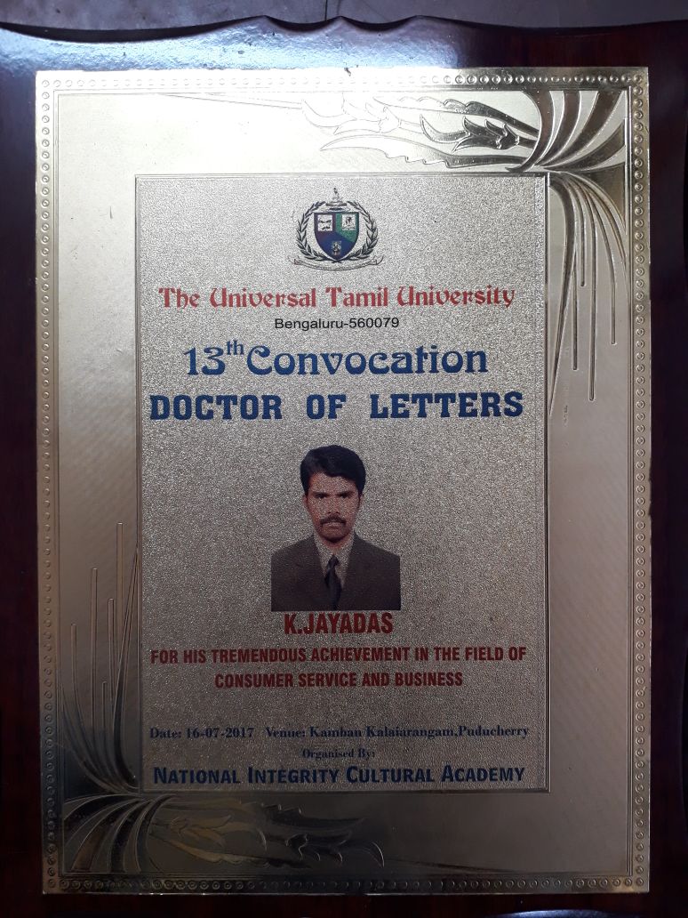 Our Company Has Recently Got Doctorate Certificate From The Universal Tamil University Bangalore For his Excellent Servicing Of More Than 17000+ Customer In a Best Way
